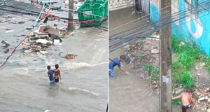 Meninos quase são atingidos por caminhão durante enchente em Guarujá.