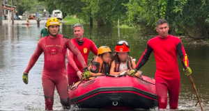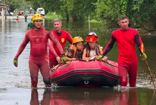 Equipes usam botes para resgatar pessoas em áreas alagadas de Peruíbe.