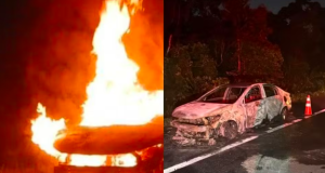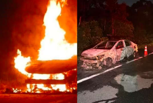 Carro pega fogo em rodovia do litoral de SP.