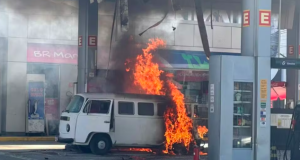 Kombi pega fogo após abastecer em posto no litoral de SP.