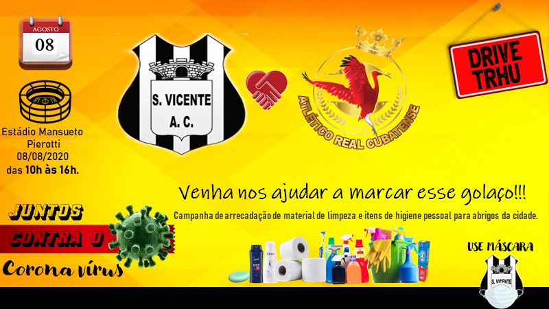Gabriel está promovendo uma campanha que visa arrecadar: material de limpeza e material de higiene pessoal. Os interessados em ajudar podem obter mais informações através da pagina do facebook.com/São-Vicente-Atlético-Clube