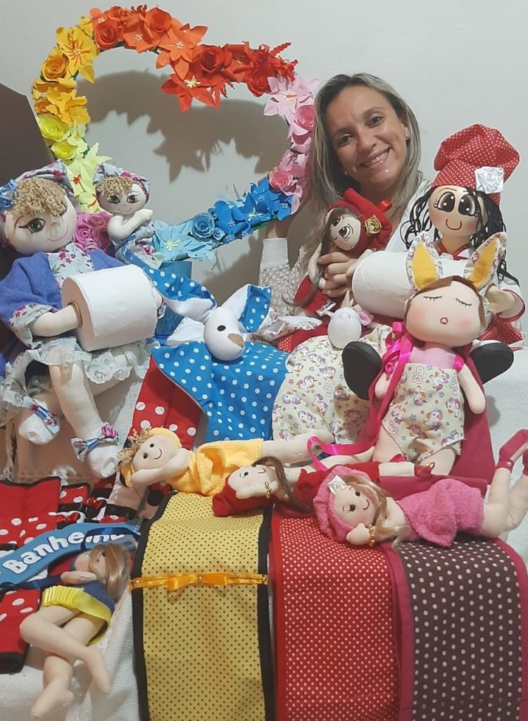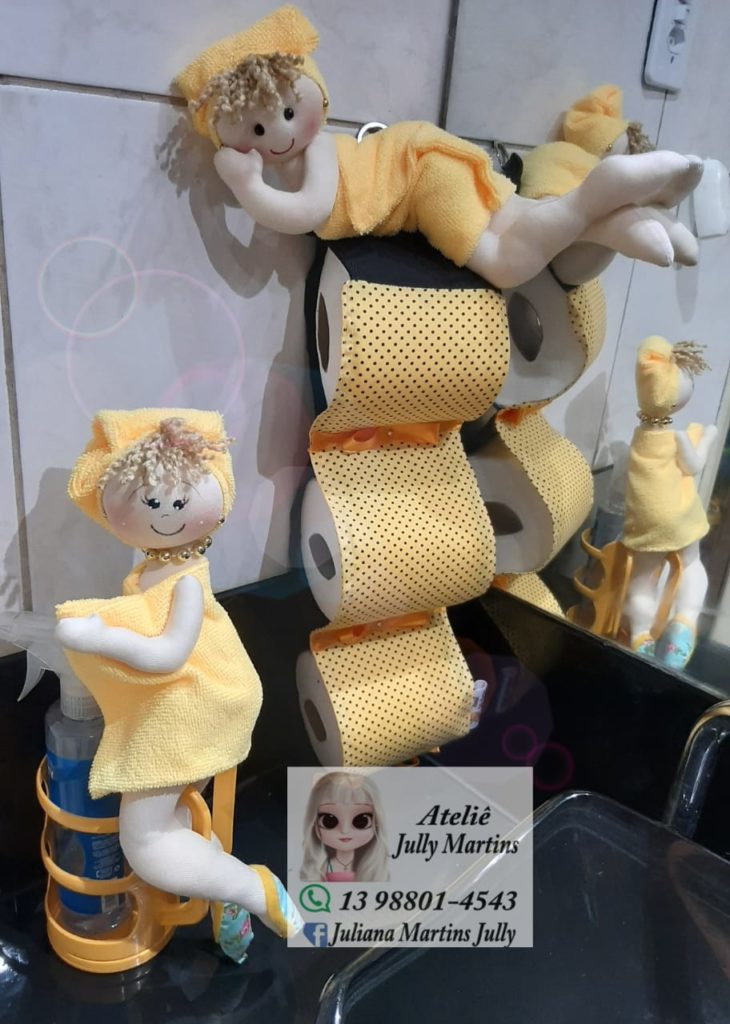 São diversos produtos, porém o carro chefe são as bonecas porta papel higiênico e toalhas.