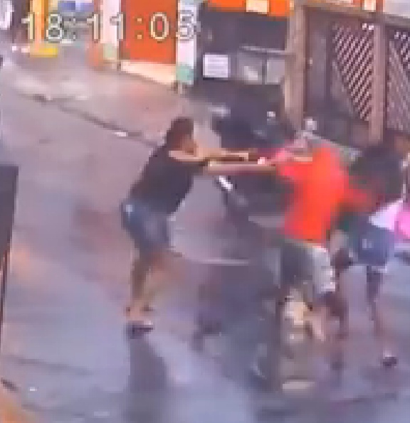 Ele tenta fugir mas o guarda-chuva atirado pela vítima atinge as rodas da bicicleta e o derruba. Na sequência alguns populares ajudam a vítima a dominar o bandido.