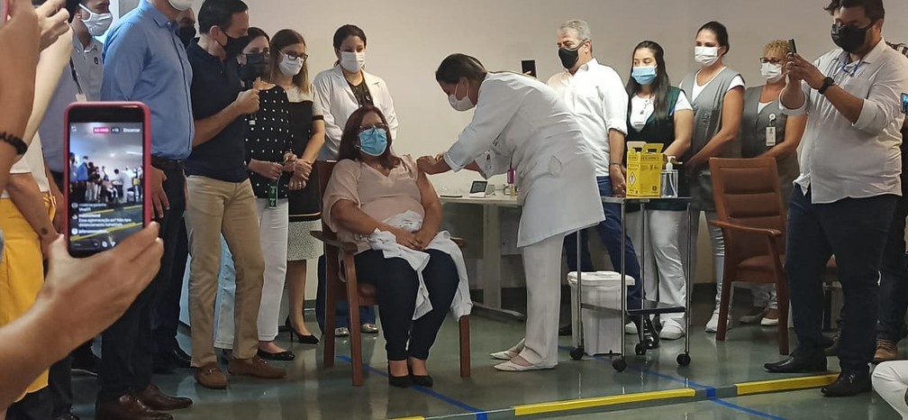A enfermeira Almira Dias Marques, de 56 anos, foi a primeira pessoa a ser vacinada contra a Covid-19 em Santos e na Baixada Santista, no litoral de São Paulo. A vacinação na cidade teve início na manhã desta quarta-feira (20), em uma cerimônia simbólica realizada no Hospital dos Estivadores, que contou com a presença do governador de São Paulo, João Doria.