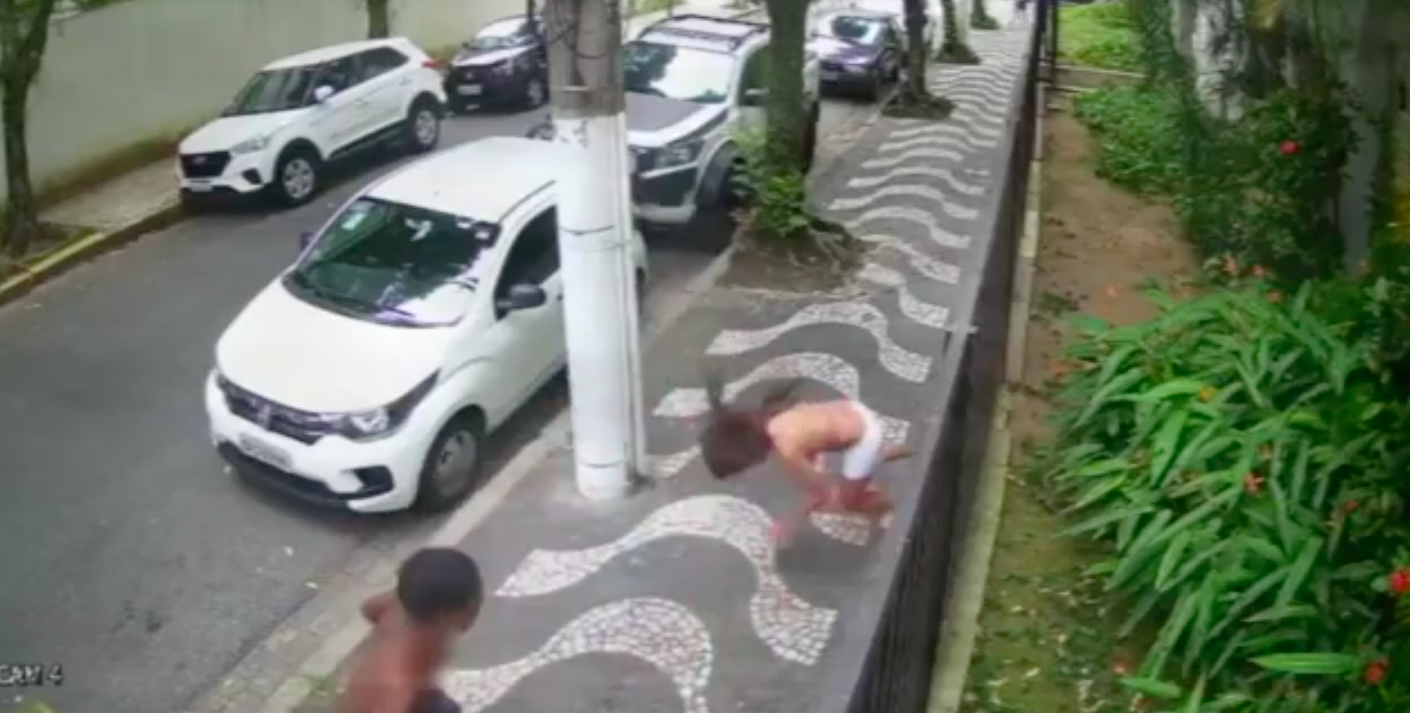 A mulher corre na direção contrária para fugir do assalto. Porém, um outro assaltante, sai de trás de um dos carros estacionados e dá um soco no rosto dela. Desnorteada, ela cai no chão e o suspeito foge.