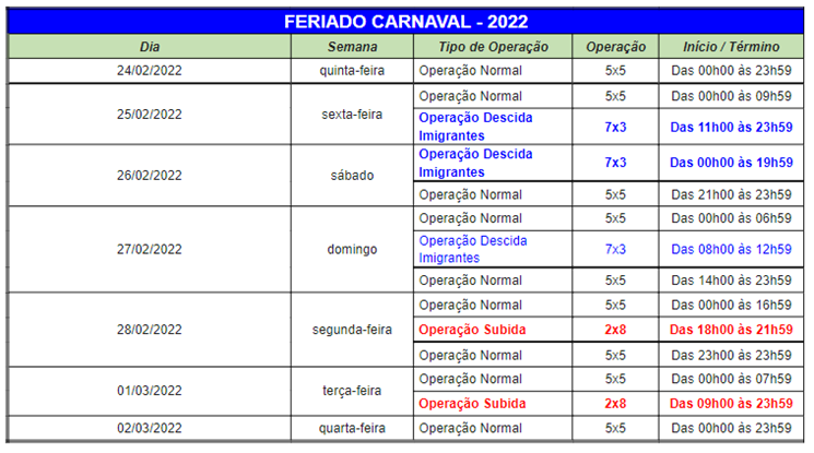 Segue abaixo tabela de implantação das operações especiais para este feriado de carnaval: