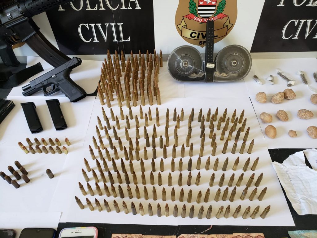 Durante a busca em imóvel determinado foi localizado o investigado e, na sua posse, um FUZIL 556, uma pistola GLOCK modelo G17 com seletor de rajada, centenas de munições de calibres 556, 762, 45, .40 e 9mm, além de DROGAS (MACONHA e MDMA), anotações e celulares.