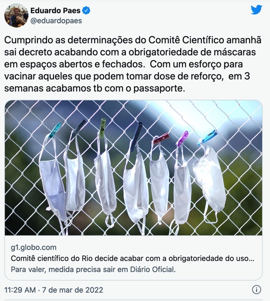 Paes ainda sinalizou que o passaporte de vacina também deve deixar de ser exigido em breve na cidade. Segundo o prefeito, caso o esforço para completar a aplicação da terceira dose tenha resultado, essa restrição deve cair daqui a três semanas. “Cumprindo as determinações do Comitê Científico amanhã sai decreto acabando com a obrigatoriedade de máscaras em espaços abertos e fechados. Com um esforço para vacinar aqueles que podem tomar dose de reforço, em 3 semanas acabamos tb com o passaporte”, escreveu Paes no Twitter.