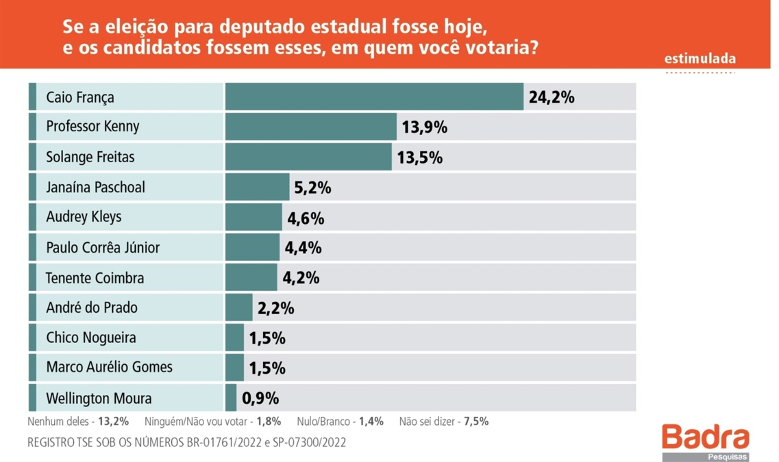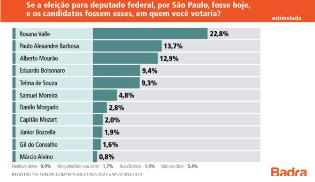 Em campo, portanto de modo presencial, os entrevistadores da Badra ouviram 1.504 eleitores, nos dias 3 e 4 de março. A pesquisa está registrada junto ao Tribunal Superior Eleitoral sob os números BR-01761/2022 e SP-07300/2022. A margem de erro é de 2,5 pontos percentuais para mais ou para menos, com intervalo de confiança de 95%.