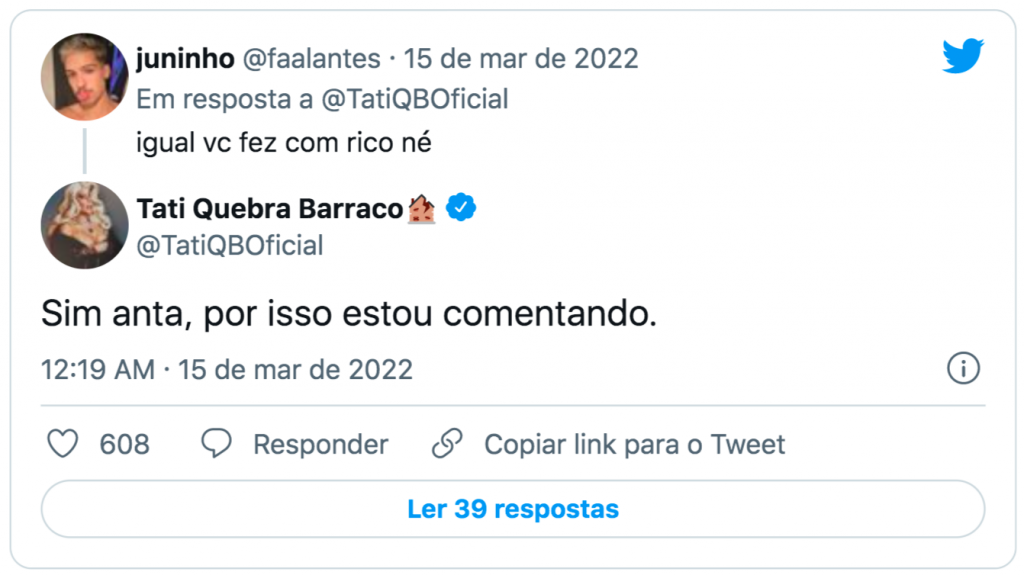 Um dos seguidores, então, resolveu apontar a hipocrisia da ex-A Fazenda 13. “Igual você fez com Rico [Melquiades], né”, relembrando do vencedor do reality da Record. A resposta de Tati não foi amigável. “Sim, anta, por isso estou comentando”.