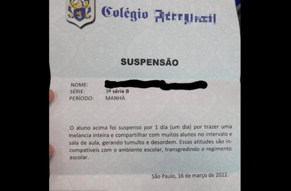 “A aluno foi suspenso por um dia por trazer uma melancia inteira e compartilhar com muitos alunos no intervalo e sala de aula, gerando tumulto e desordem”, diz a suspensão do colégio.