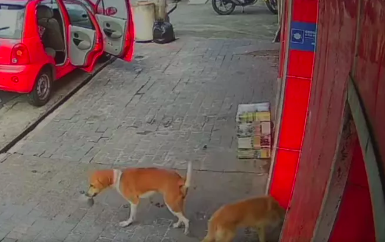 Uma câmera de segurança de um pet shop flagrou, um vira-lata caramelo furtando ração em Guarujá, na Baixada Santista. O cão ladrão entra no estabelecimento, pega um saco de ração e sai abanando o rabo com um comparsa de quatro patas também.