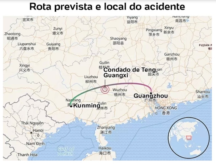 O último ponto de contato do voo, segundo o referido portal, estava cerca de 25 quilômetros a sudoeste de Wuzhou, a uma altitude de 3.225 pés (989 metros), às 14h22, que significaria que em apenas três minutos o veículo desceu quase 8.000 metros.