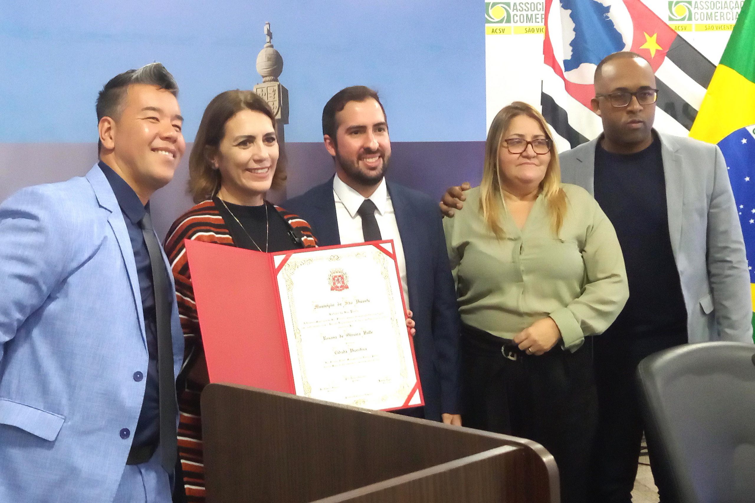 Na noite desta sexta-feira (29) a Deputada Federal Rosana Valle recebeu o Título de Cidadão Vicentino. O evento foi realizado pelo vereador Jhony Sasaki e foi dado a deputada pelos relevantes serviços prestados a cidade de São Vicente, antes mesmo de ser deputada federal.