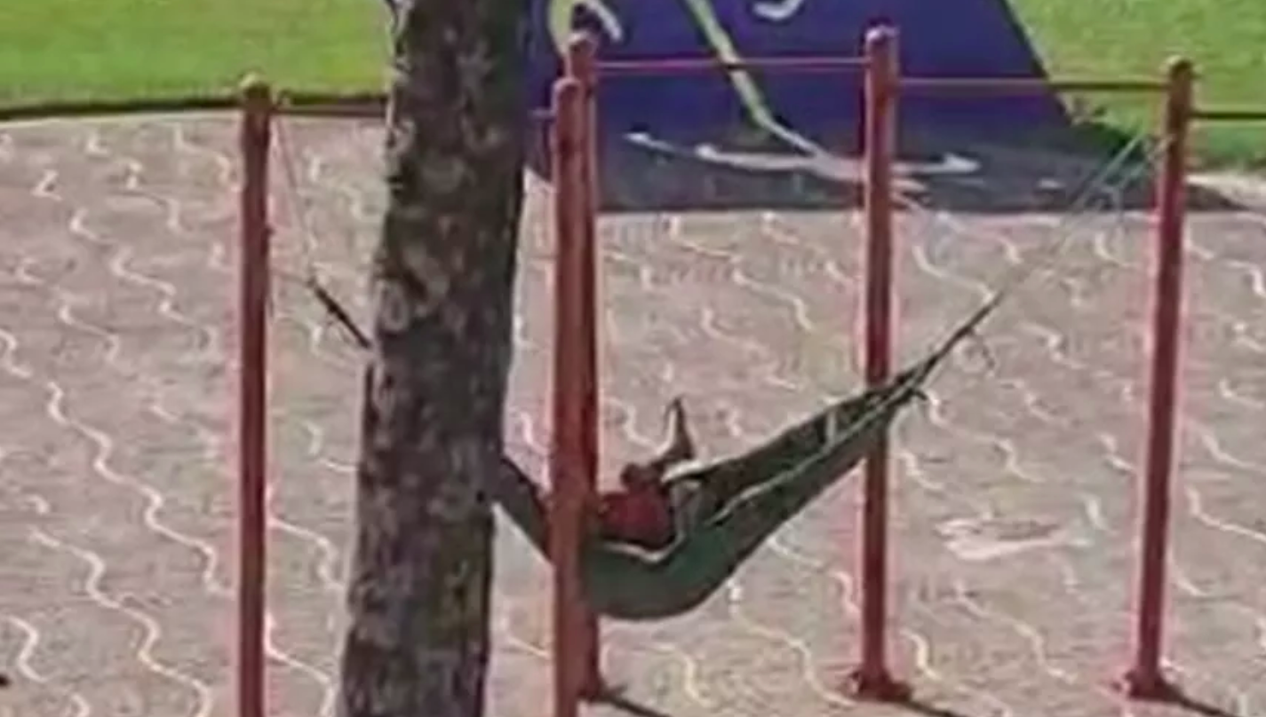 Antes de deixar o local onde ‘lutou’ e ‘dançou’, o homem resolveu descansar. Colocou uma rede no aparelho de barra e deitou para tirar um cochilo.