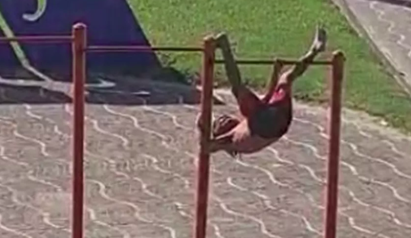 O homem chegou fazer uma série de movimentos semelhantes aos praticados no caratê, antes de deslizar pela estrutura como se estivesse em um pole dance.