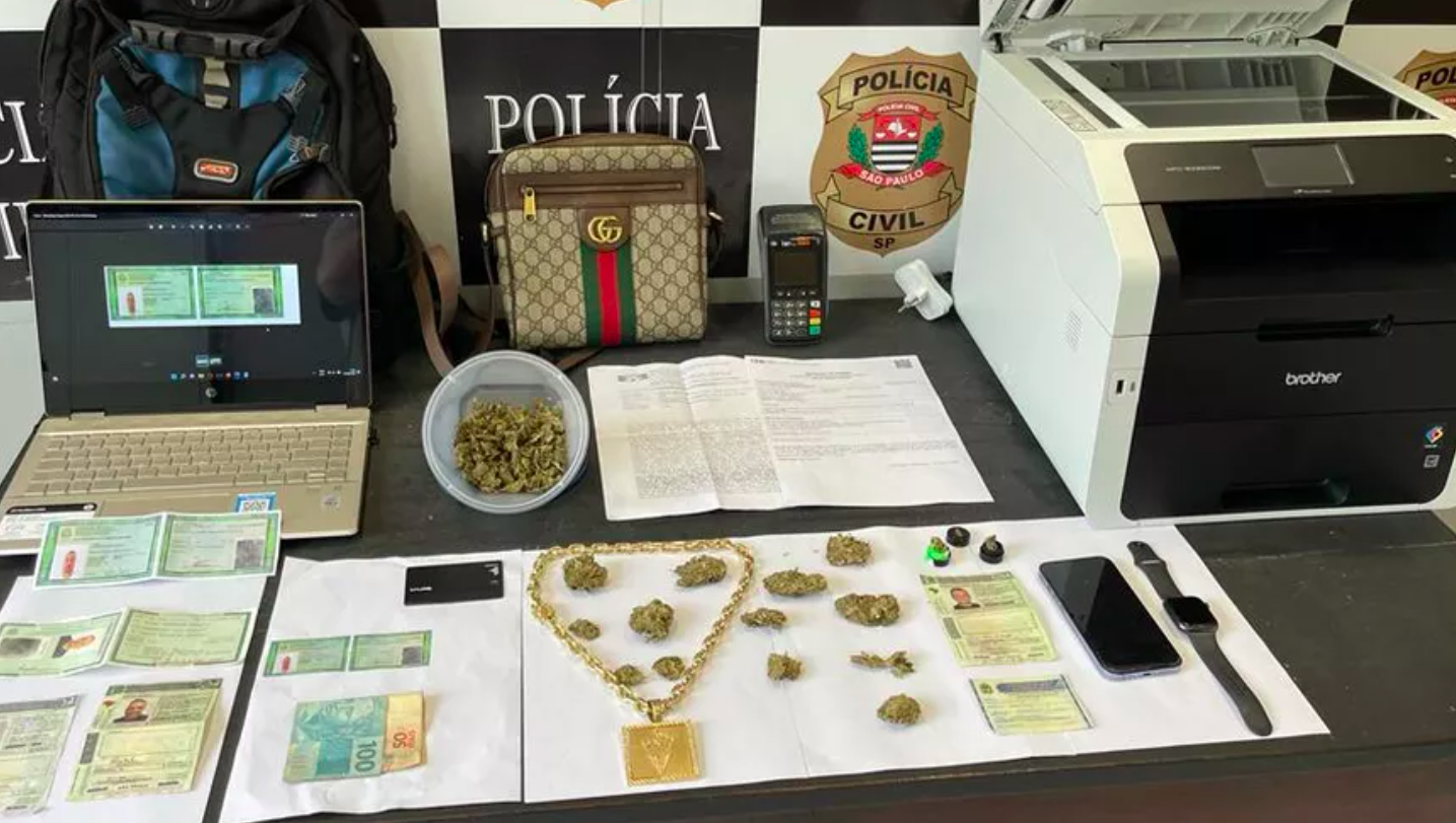 O apartamento dele era utilizado como escritório para realizar crimes patrimoniais por meio digital. No local, os policiais apreenderam 70 gramas de skunk a granel, além de um notebook, uma impressora, cartões bancários, máquina de cartão, R$ 150 e diversos documentos falsos.