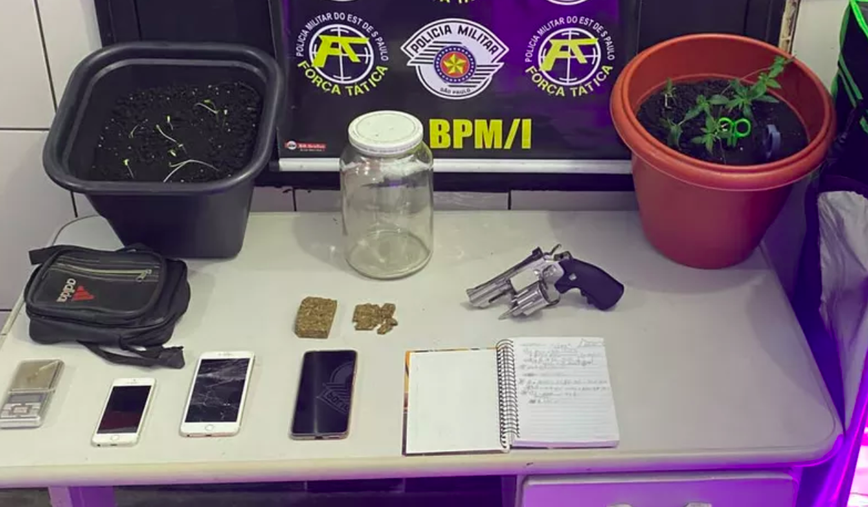 Na tentativa frustrada, o suspeito acabou se machucando e logo foi detido pelos policiais. No apartamento, os agentes encontraram dois vasos com mudas de maconha, um tablete de 65g do entorpecente, um revólver e anotações que indicavam o tráfico, três celulares e uma balança.