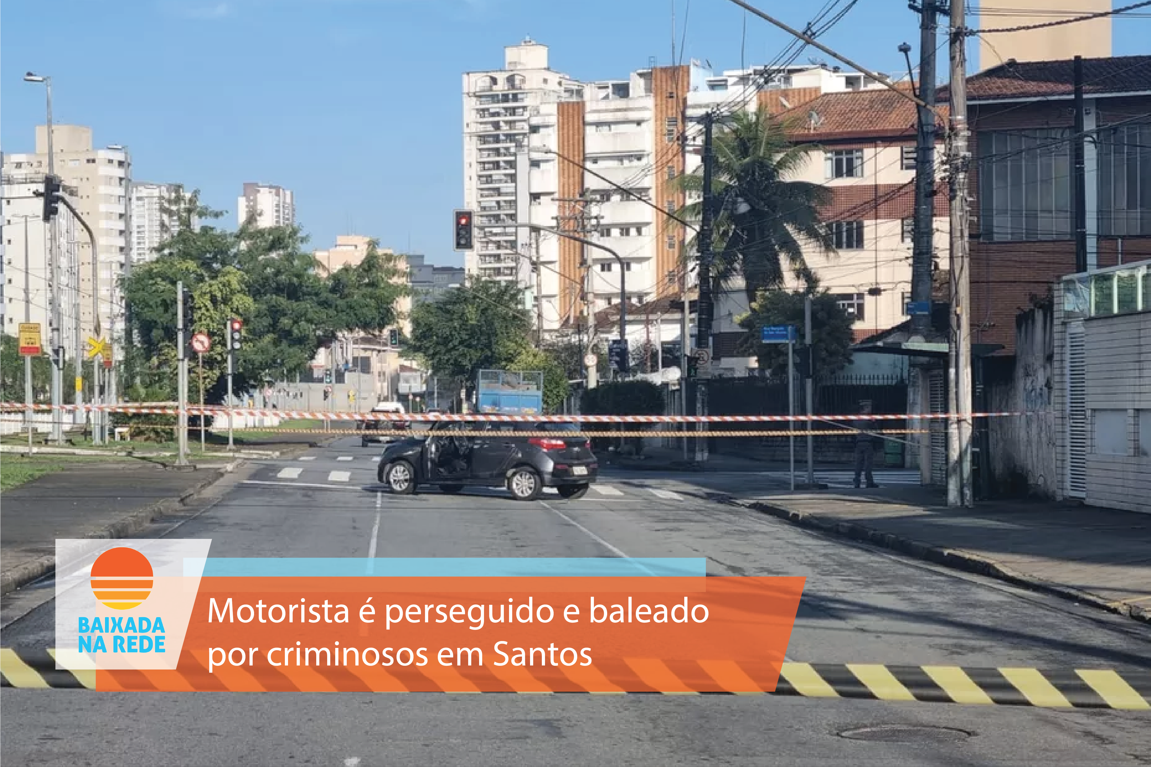 Um motorista foi perseguido e baleado, após ter o carro fechado por criminosos em uma avenida de Santos, na manhã desta quinta-feira (21).