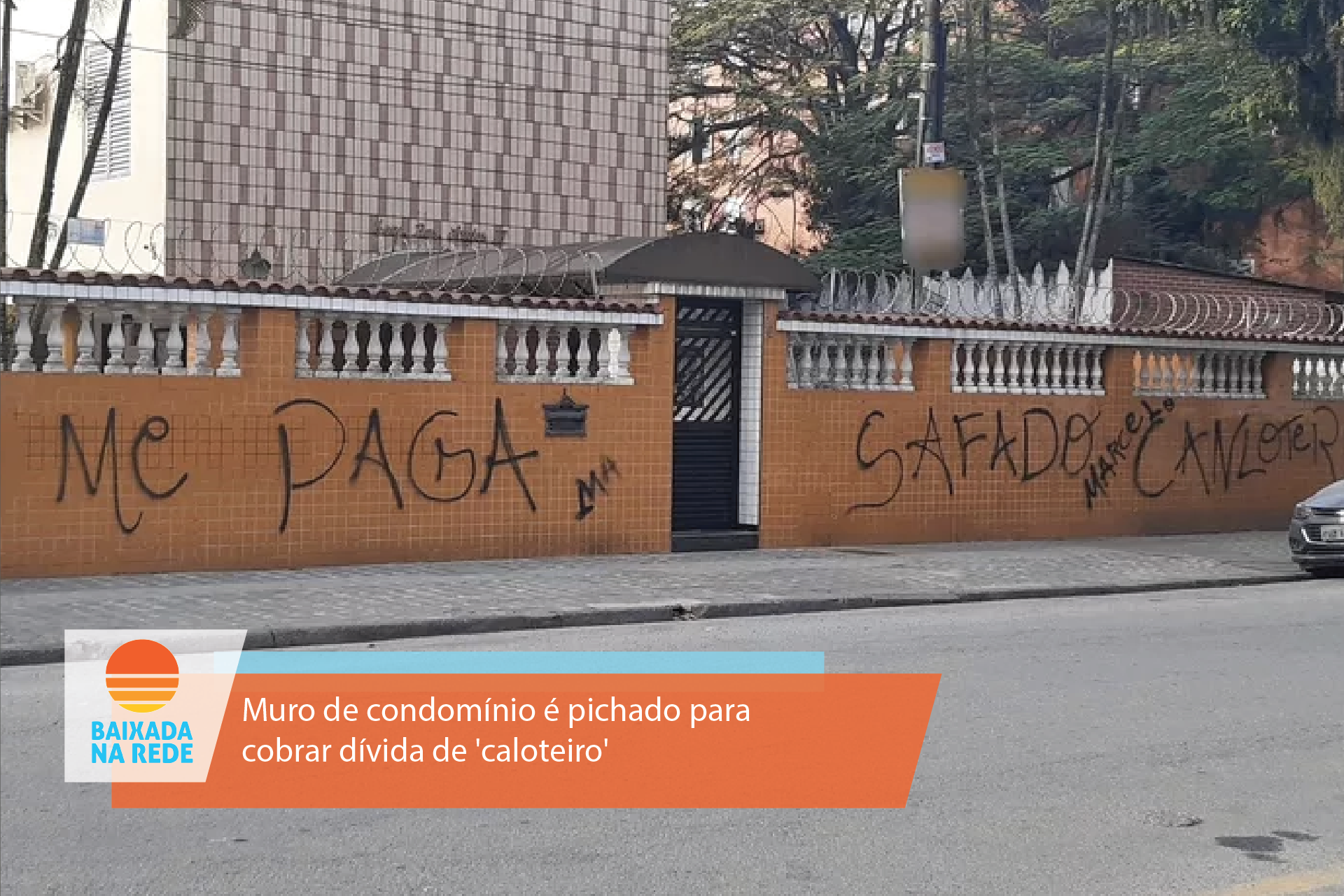 O muro de um conjunto habitacional em Santos, vem sendo pichado para cobrar um suposto “caloteiro”. Pela manhã, os dizeres são removidos por um homem que, segundo moradores, é o próprio alvo das cobranças.