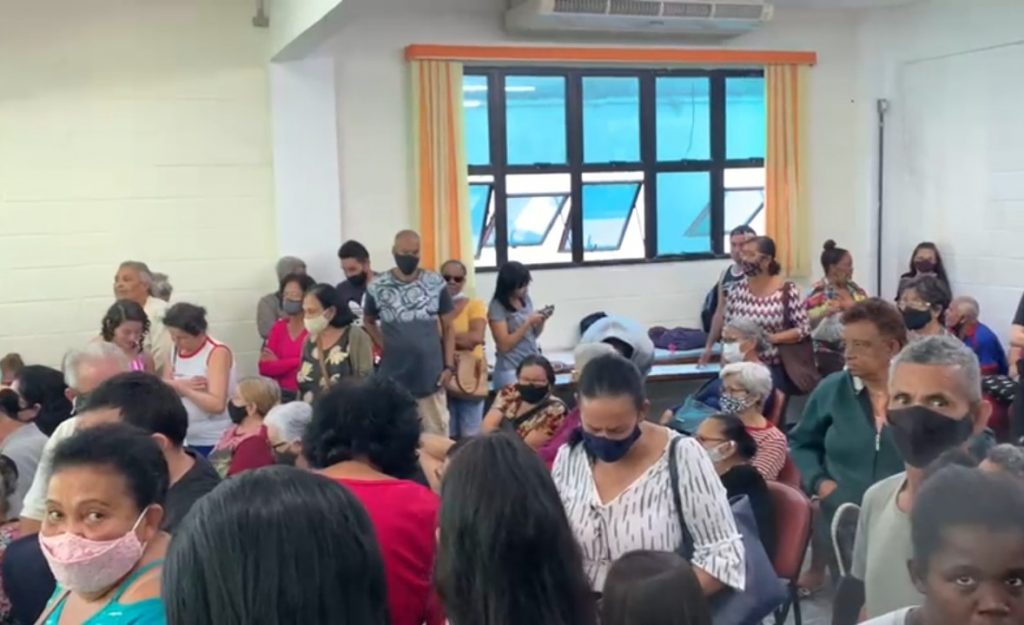Na sala onde o cadastro estava sendo realizado, aproximadamente 100 pessoas, em sua maioria idosos, aguardavam o atendimento. O local não tinha ventilação adequada, sendo que ainda estamos na Pandemia e a maioria das pessoas fazem parte do grupo de risco apesar da vacinação.