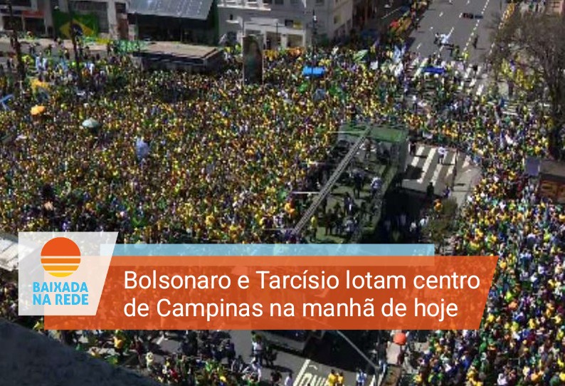 O presidente Jair Bolsonaro, que veste uma camisa amarela, foi cumprimentado por apoiadores que o aguardavam ao som de “mito, mito” e “primeiro turno, primeiro turno” antes de comício para reeleição realizado no Largo do Rosário, região central de Campinas, interior de São Paulo.