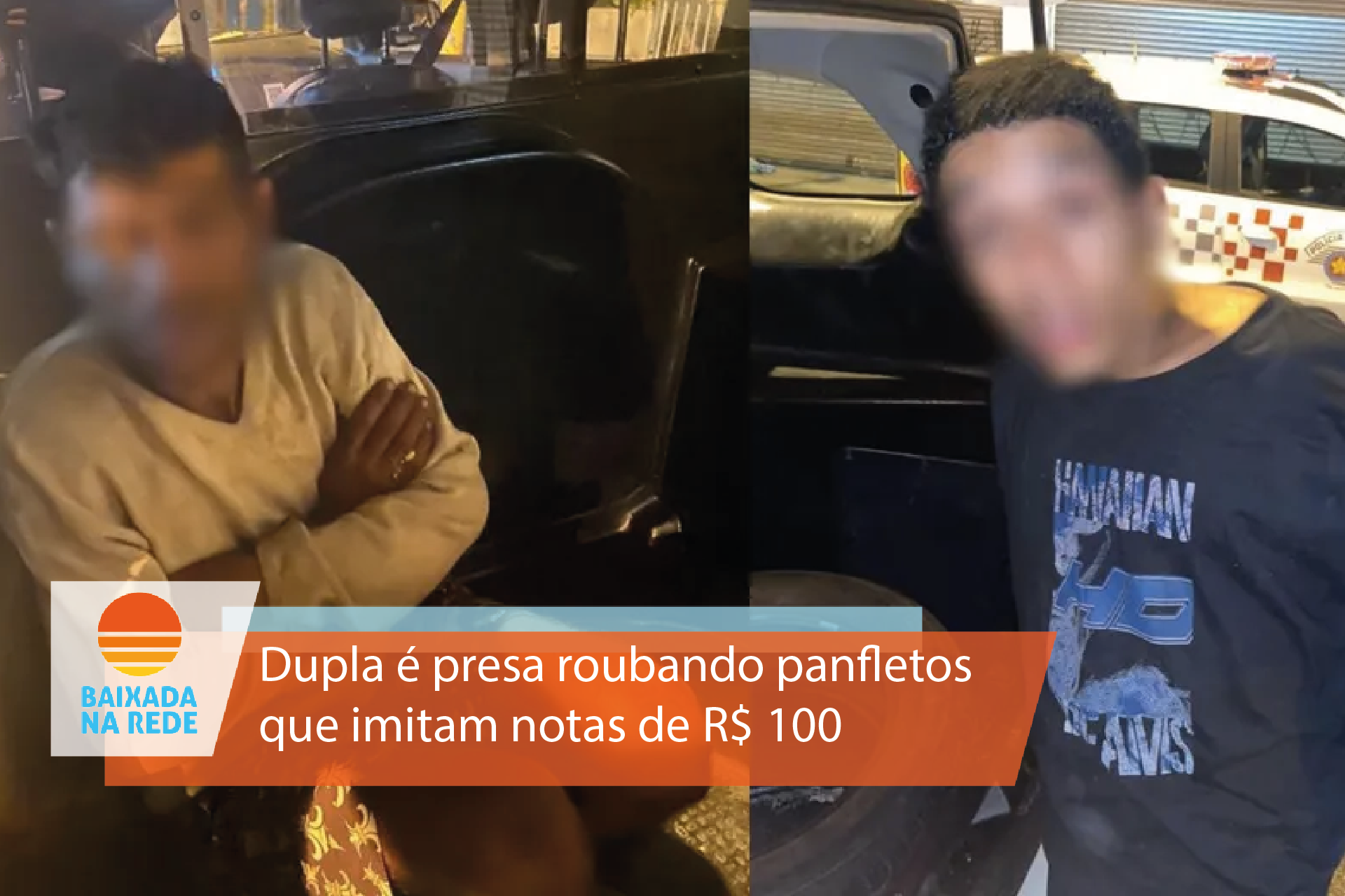 Dois homens, de 20 e 48 anos, foram presos em flagrante após invadirem um restaurante, e furtarem centenas de panfletos que imitavam notas de R$ 100.