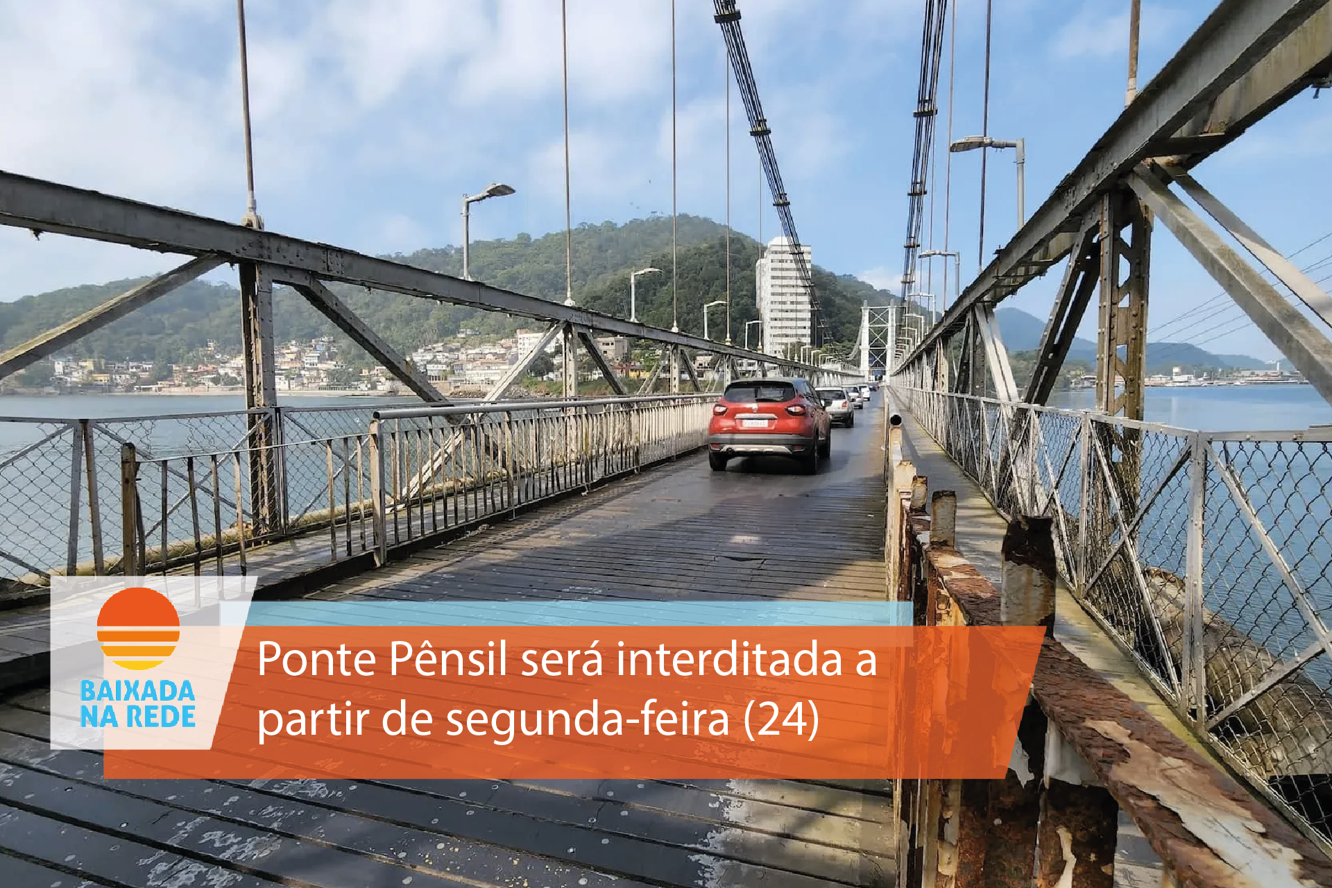 A Ponte Pênsil, um dos cartões postais de São Vicente, na Baixada Santista, passará por uma obra de recuperação estrutural, precisando ser interditada a partir desta segunda-feira (24). A manutenção deve seguir ao longo do dia, mas os bloqueios ocorrem apenas no período noturno, entre 20h e 6h, para tentar diminuir os impactos no trânsito.
