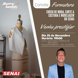 Será realizada na noite da próxima sexta-feira a festa de conclusão do curso de Moda, Corte & Costura e Modelagem do SENAI. A festa terá início as 19h na Associação Comercial de São Vicente e a entrada é aberta ao público.