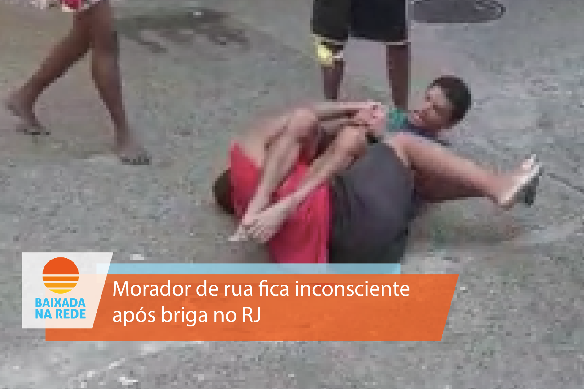 Já desmaiado, outras pessoas correm para socorrer o morador de rua caído inconsciente na calçada.
