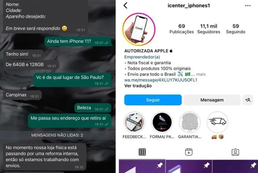 O morador explica que, na última terça-feira (10), comprou um celular iPhone 11 com um suposto vendedor, que já o havia chamado anteriormente tentando vender aparelhos celulares pelo Instagram. As negociações duraram dias e por diversas vezes, o morador chegou a questionar a operação mas realizou o pagamento antecipado do valor.