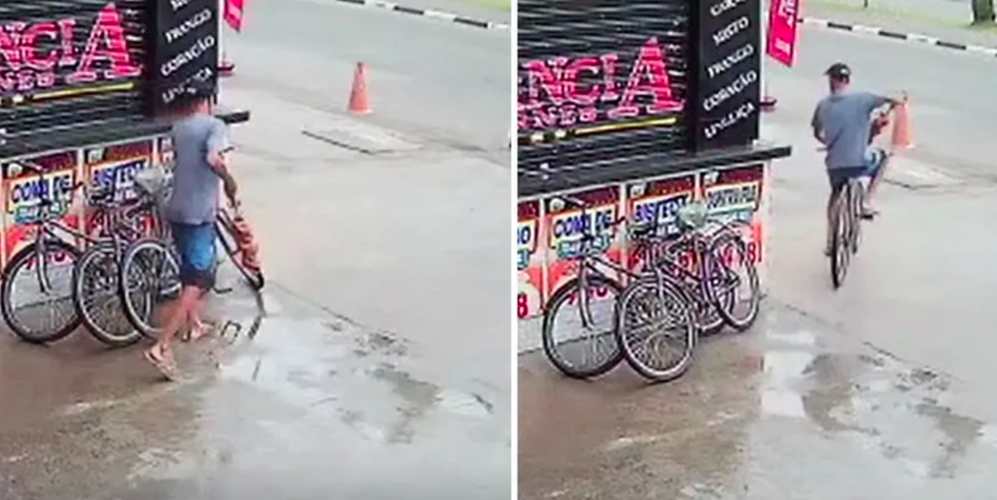 Sem que ninguém visse, o homem se aproximou da máquina e puxou um espeto com os frangos. Na sequência, ele subiu na bicicleta e, em aproximadamente cinco segundos, ele fugiu com o espeto furtado.