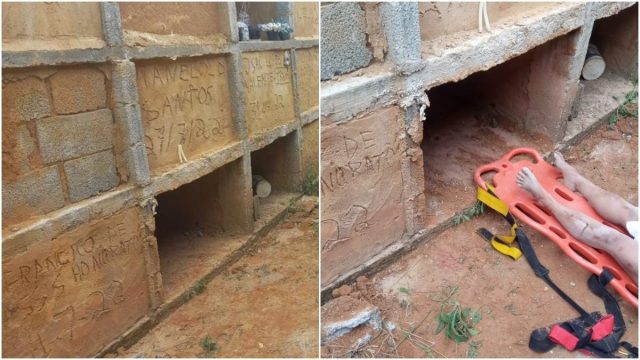 A mulher foi encontrada por funcionários do cemitério. Eles chegaram para trabalhar e encontraram a estrutura fechada com cimento fresco e sangue no local. Policiais foram chamados e ouviram gritos de socorro. A suspeita é que ela tenha ficado 10 horas no túmulo.