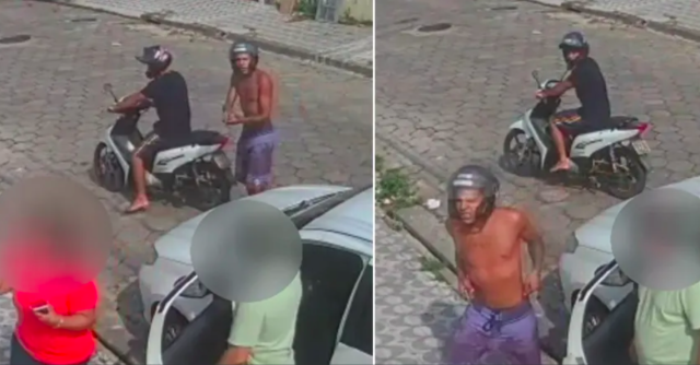 A mulher, que não havia notado a atitude suspeita dos homens, caminhou em direção ao portão da casa, momento em que um dos assaltantes desceu da moto e abordou as vítimas. É possível ver o garupa, sem camisa, com capacete na cabeça e uma arma na mão, anunciando o assalto.