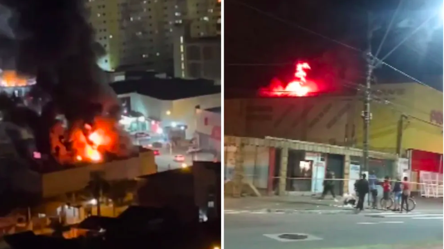 As chamas atingiram a parte superior da loja. Moradores próximos ao local registraram em vídeo a densa fumaça saindo do local.