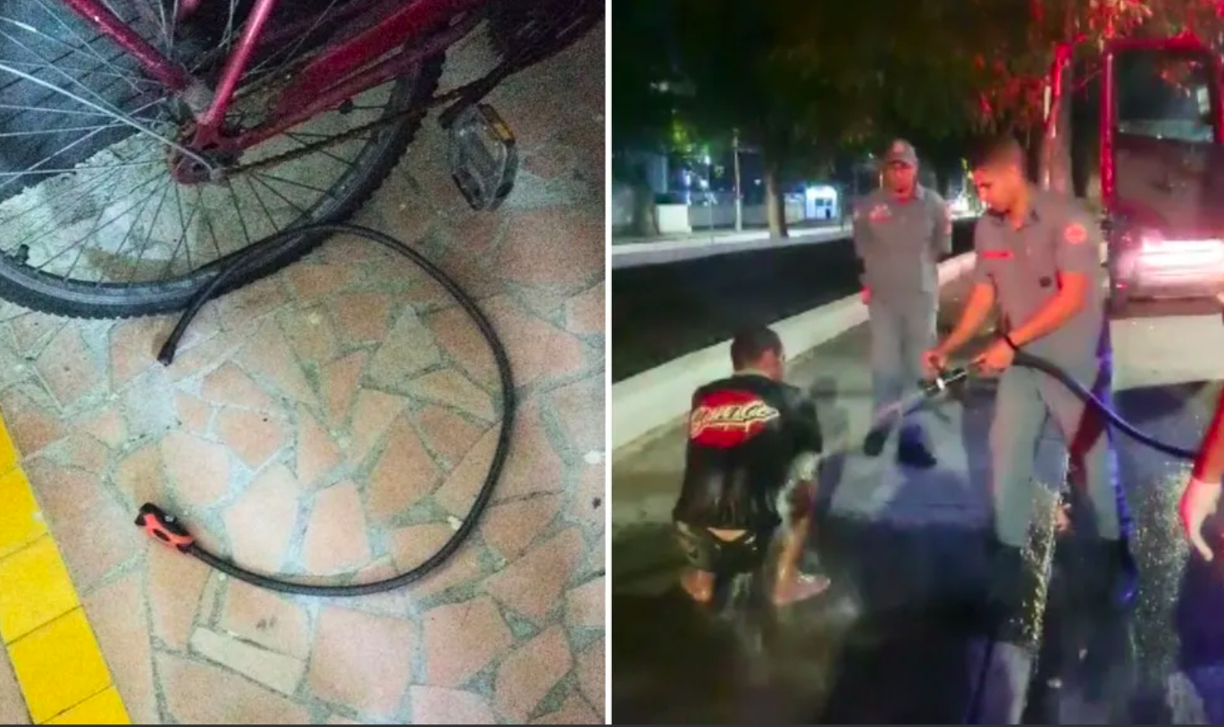 O suspeito abandonou a bicicleta e entrou no canal. De lá, acessou uma tubulação e as galerias de esgoto. Nas imagens abaixo é possível ver os profissionais do Corpo de Bombeiros jogando água no homem para limpá-lo.
