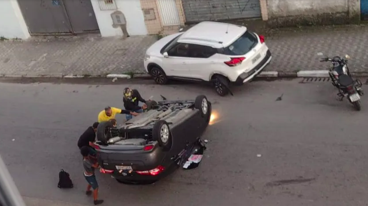Um veículo capotou na Rua Mascarenhas de Morais, deixando moradores assustados e duas pessoas feridas, em São Vicente, na Baixada Santista.