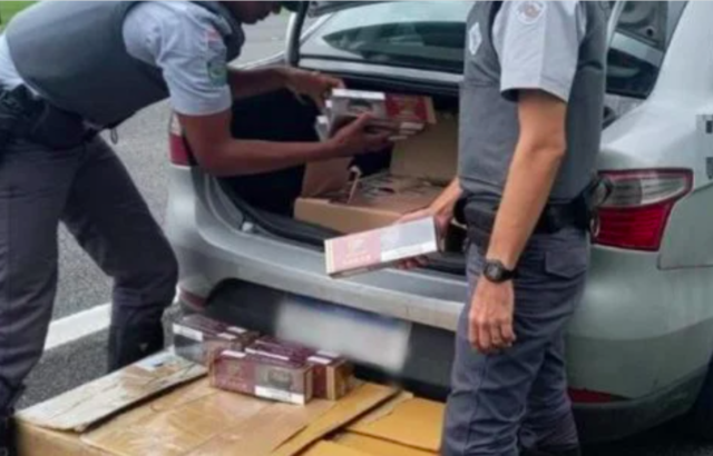 Os policiais abordaram o veículo, que era ocupado por duas pessoas. Durante as buscas, foram encontrados 2,1 mil maços de cigarro de marca estrangeira, afirma a Secretaria da Segurança Pública (SSP).