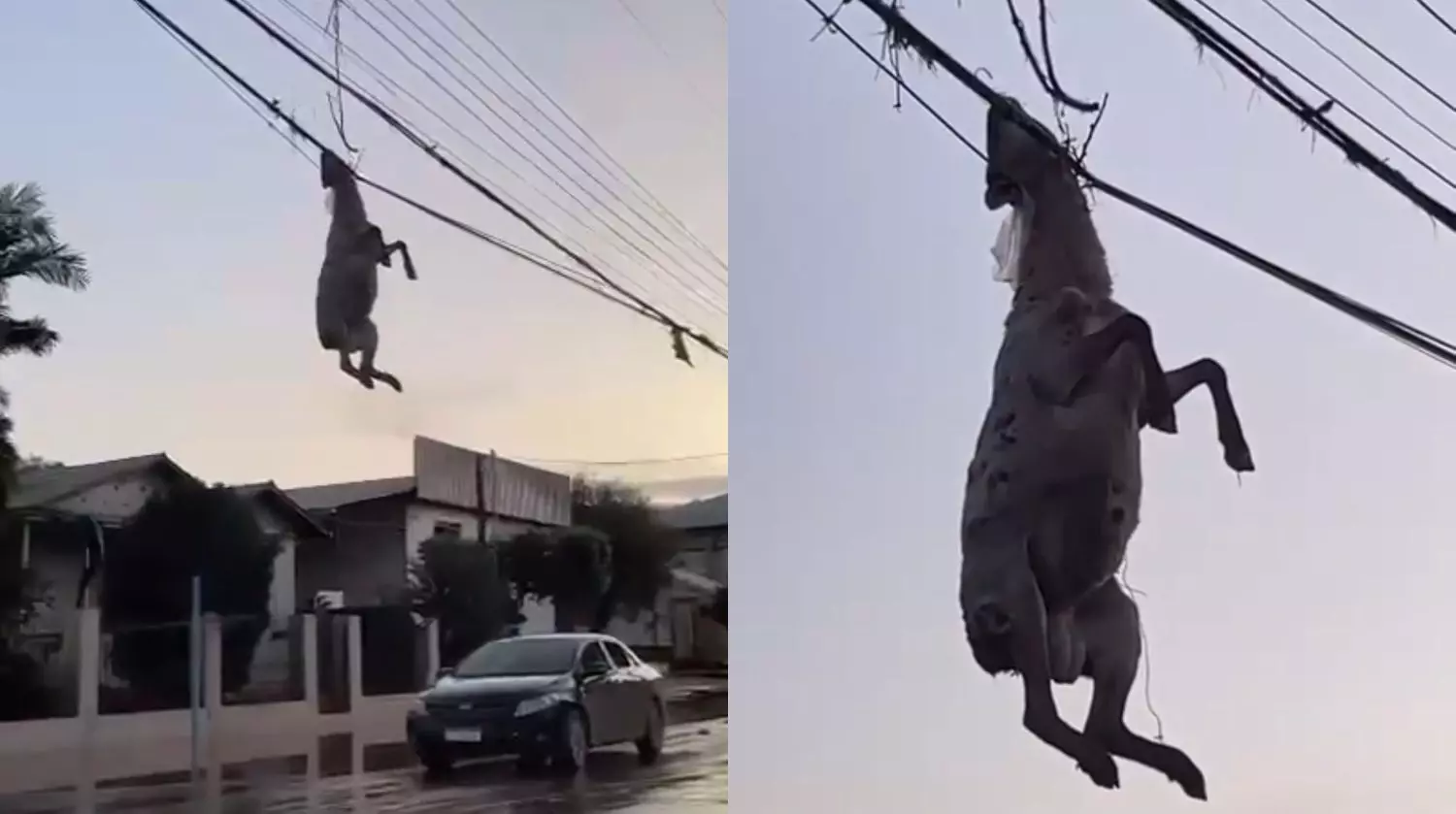 O animal estava pendurado na Avenida Fernando Ferrari, que ficou submersa após a chuva. No momento do registro, o animal já estava morto.