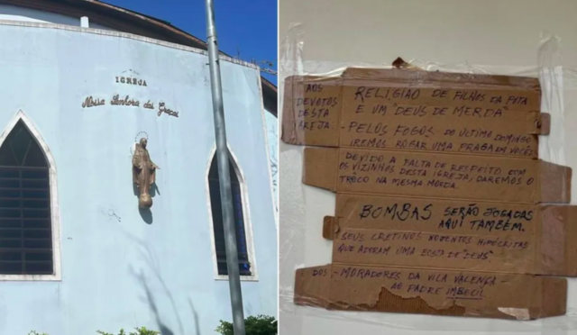 Um cartaz com xingamentos e ameaças de bombas foi colado na porta da Paróquia Nossa Senhora das Graças em São Vicente, na Baixada Santista. Um boletim de ocorrência e a Polícia Civil investiga o caso.