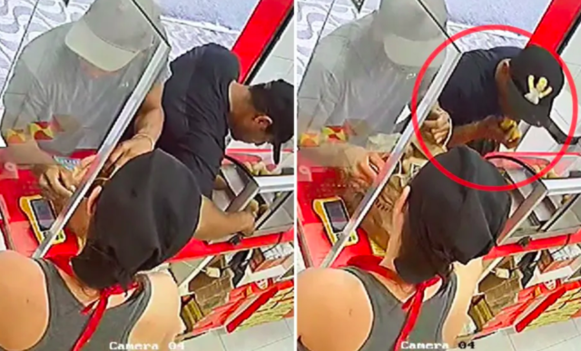 No vídeo, dois homens armados aparecem apoiados no balcão do estabelecimento. Enquanto falavam com a atendente, um deles decidiu abrir a vitrine dos salgados. Ele selecionou alguns alimentos e comeu a coxinha ainda no local.