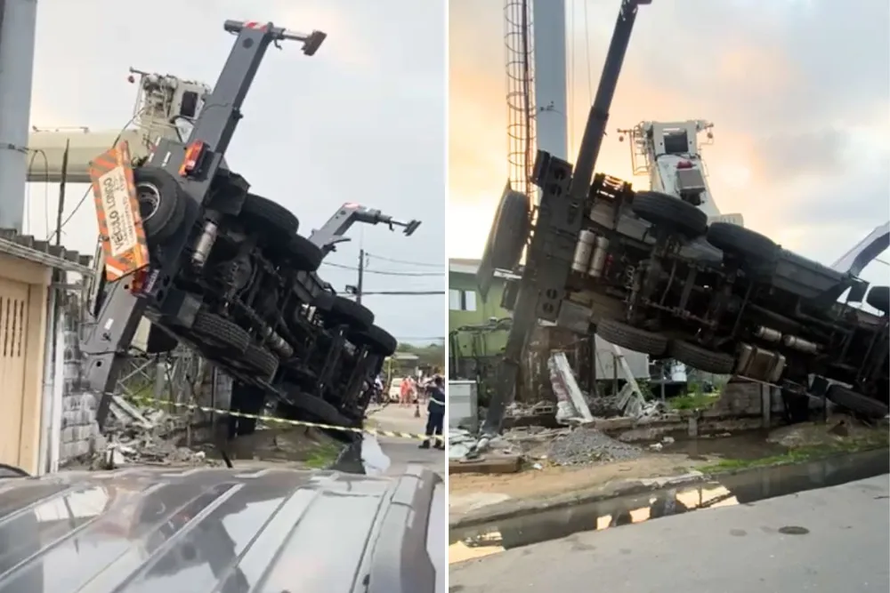 Início Baixada Santista Caminhão guindaste em cima de oito casas no litoral de SP