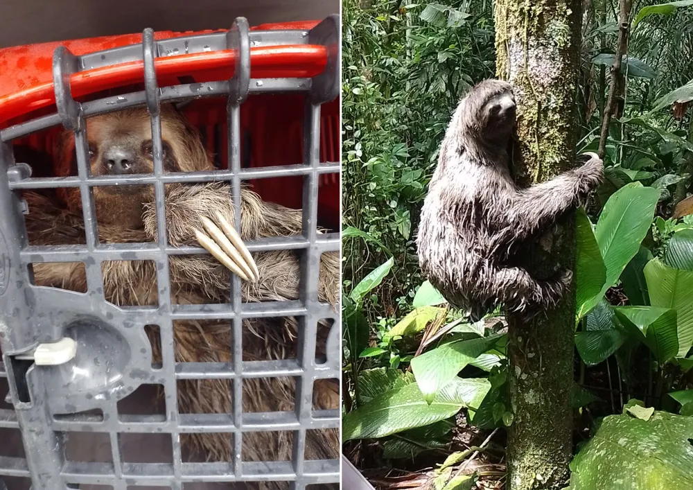 Depois de ser resgatado, o animal foi liberado em uma região de floresta situada no coração da Área de Proteção Ambiental Serra do Guararu. O bicho-preguiça havia sido encontrado nas instalações de um terminal de contêineres.