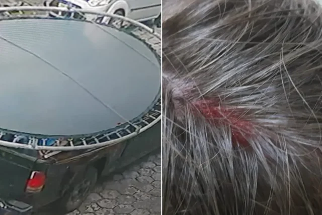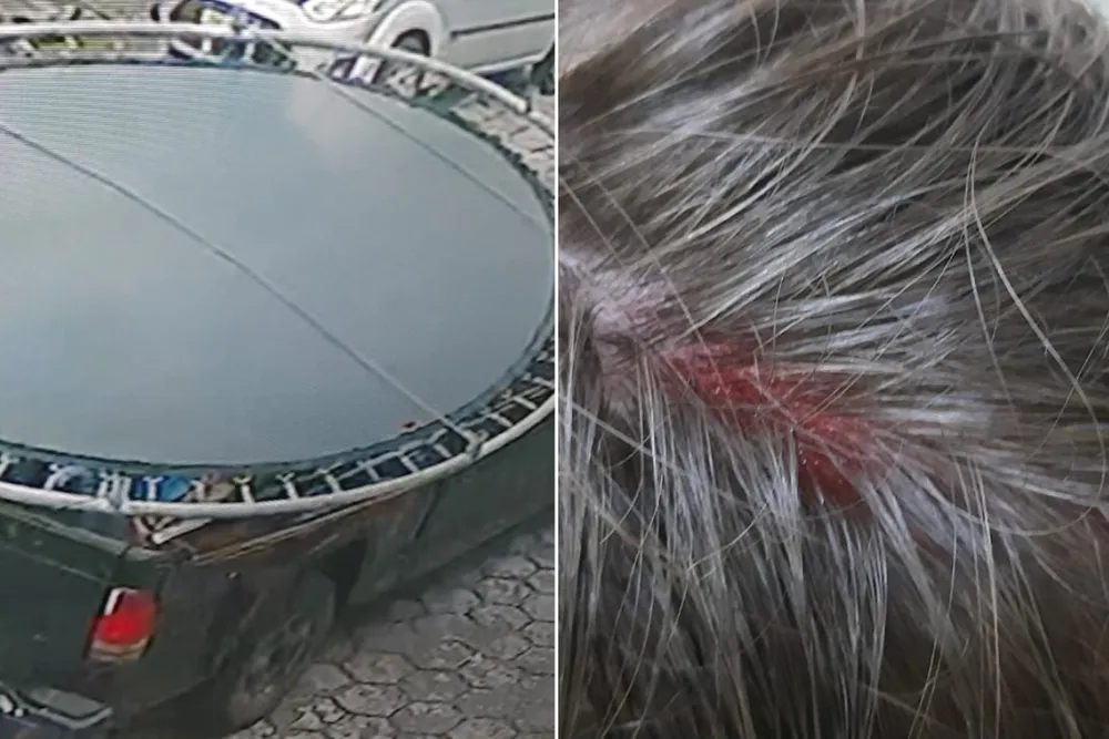 Uma criança de 11 anos ficou ferida após ser atingida na cabeça por uma cama elástica que estava sendo transportada de maneira irregular em uma caminhonete, em Itanhaém, no litoral de São Paulo. Imagens registradas mostram o momento em que a vítima foi atingida e o motorista partindo do local sem prestar socorro.