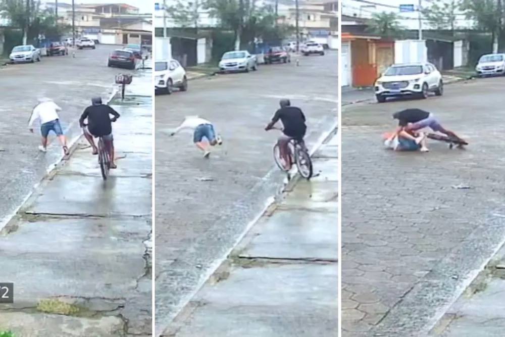 Um vídeo, divulgado nesta terça-feira, 24 de outubro, mostra um homem perdendo o equilíbrio e caindo no meio da rua enquanto era perseguido em São Vicente, litoral de São Paulo. De acordo com informações de residentes locais, o suspeito, que estava em uma bicicleta, teria roubado o celular de uma vítima.