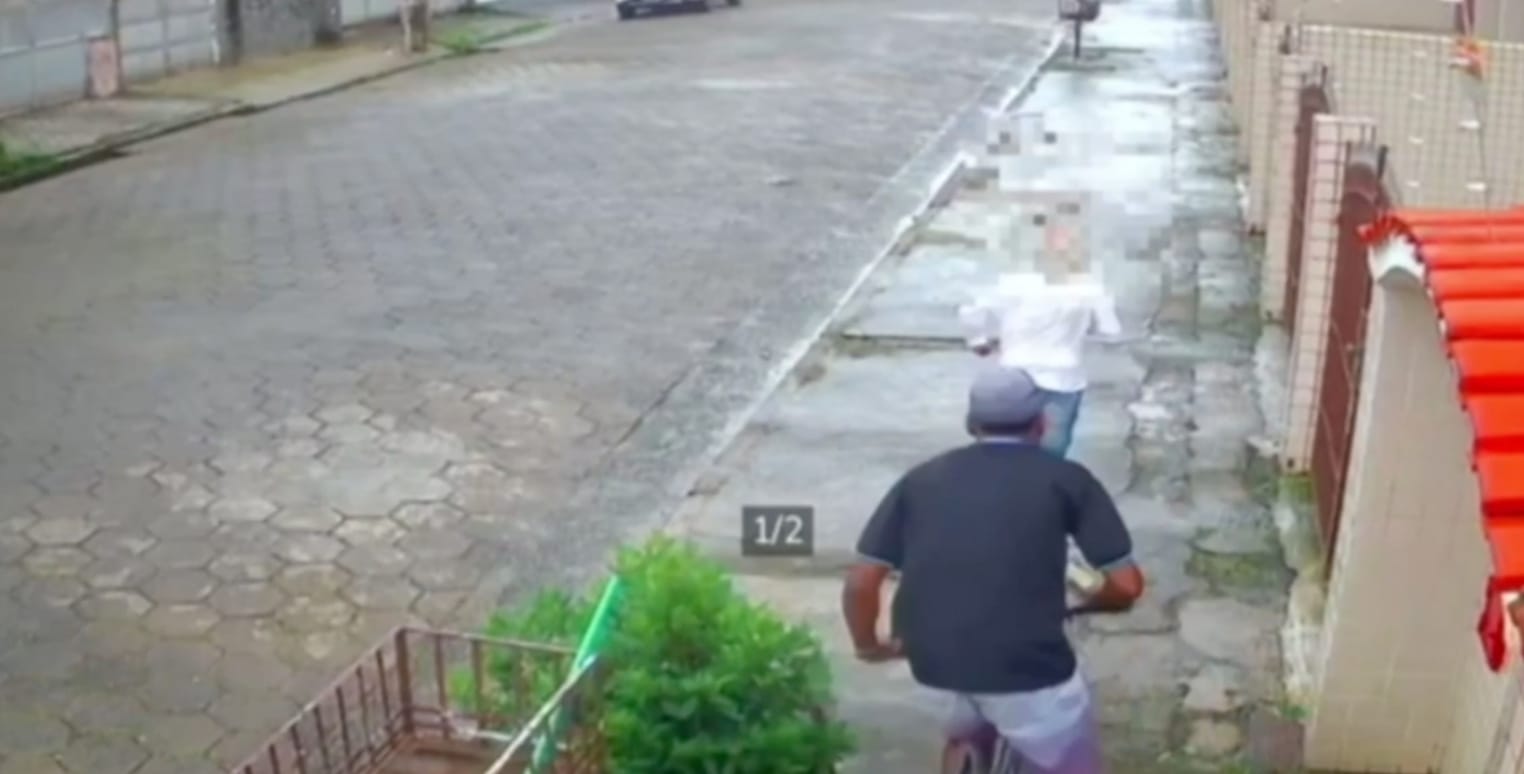 No vídeo, é possível observar um homem vestindo uma camisa branca caminhando pela calçada antes de ser avistado pelo suspeito, que pedalava uma bicicleta do outro lado da rua. O suspeito faz meia-volta e passa a perseguir a vítima, que acaba caindo no chão e é abordada.