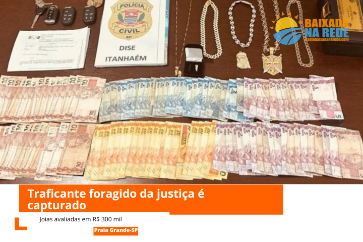 Edmar da Silva Alves, de 35 anos, condenado a 18 anos de prisão por tráfico de drogas em 2019, foi preso em Praia Grande, na Baixada Santista. O homem estava na condição de foragido e foi capturado por policiais civis no interior de uma residência, onde foram apreendidos veículos, celulares, dinheiro e joias avaliadas em mais de R$ 300 mil.