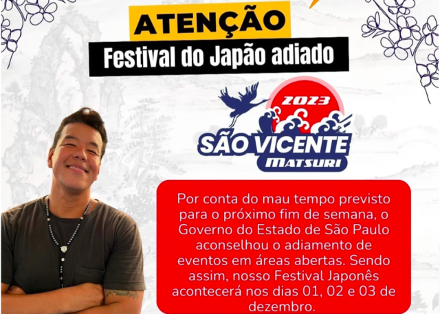 O Festival São Vicente Matsuri, voltado para a cultura japonesa que começaria nesta sexta-feira (24), em São Vicente, na Baixada Santista, foi adiado devido à previsão de fortes chuvas para os dias 01, 02 e 03 de dezembro.