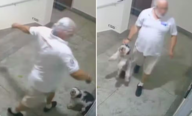 Nas imagens, gravadas por uma câmera de monitoramento no corredor do prédio, é possível ver o homem dando quatro chutes no animal antes de pegá-lo pela pescoço e ‘caminhar’ com ele na mão.