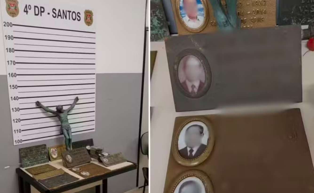 Ela, no entanto, permaneceu com os policiais e demais participantes da operação. No local, foram realizadas buscas e encontradas nove placas de metal e uma imagem religiosa. Os itens haviam sido furtados do cemitério municipal do Paquetá.